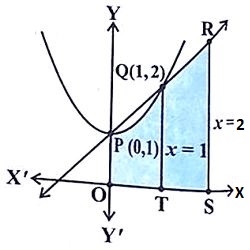 The correct answer is Option (1) → $\frac{23}{6}$ Let us first sketch the region whose are is to be found out. This region is the intersection of the following regions: $A_1 = \{ (x, y) : 0 \leq y \leq x^2 + 1 \}$, $A_2 = \{ (x, y) : 0 \leq y \leq x + 1 \}$ and $A_3 = \{ (x, y) : 0 \leq x \leq 2 \}$ The points of intersection of $y = x^2 + 1$ and $y = x + 1$ are points $P(0, 1)$ and $Q(1, 2)$. From Figure, the required region is the shaded region $OPQRST$ whose area: $= \text{area of the region } OTQPO + \text{area of the region } TSRQT$ $= \int\limits_{0}^{1} (x^2 + 1) \, dx + \int\limits_{1}^{2} (x + 1) \, dx$ $= \left[ \left(\frac{x^3}{3} + x\right) \right]_{0}^{1} + \left[ \left(\frac{x^2}{2} + x\right) \right]_{1}^{2}$ $= \left[ \left( \frac{1}{3} + 1 \right) - 0 \right] + \left[ (2 + 2) - \left( \frac{1}{2} + 1 \right) \right] = \frac{23}{6}$ |