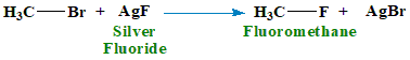 Let us look at each of the reactions : A. Swarts Reaction: (III) \(RX + AgF \longrightarrow R-F + AgX\) The Swarts reaction is commonly used to produce alkyl fluorides from alkyl chlorides or alkyl bromides. This is accomplished by heating alkyl chloride/bromide in the presence of heavy metal fluoride (silver fluoride or mercurous fluoride for example). The reaction will proceed if sodium fluoride or potassium fluoride are used, but the yield will be greatly reduced. In 1892, Frederic Jean Edmond Swarts was the first to report this phenomenon. The swarts reaction is also known as swarts fluorination. Chlorine is most commonly replaced by fluorine in organic compounds via Swarts fluorination in the presence of antimony salts, where its oxidation state is +5. \(RX + AgF \longrightarrow R-F + AgX\) For example: