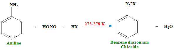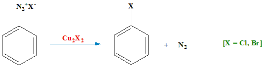 (C) Sandmeyer's Reaction: (I) \(C_6H_5NH_2 + NaNO_2 + HX + Cu_2X_2 \longrightarrow C_6H_5X + N_2\): A freshly made diazonium salt solution is treated with cuprous chloride or cuprous bromide dissolved in the appropriate halogen acids to produce chloro and bromoarenes. This process is known as the Sandmeyer reaction. The benzene diazonium salts necessary for this procedure are made by reacting an aqueous solution of sodium nitrite with an ice-cold solution of aniline that is excessively diluted in HCl at a low temperature of 273-278 K (0-5°C). The process is referred to as a diazotization reaction.