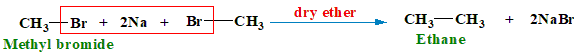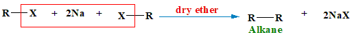D. Wurtz Reaction: (II) \(2RX + 2Na \longrightarrow R-R + 2NaX\): Wurtz reaction is a coupling reaction which is developed by Charles-Adolphe and used in organic chemistry and organometallic chemistry. Wurtz reaction aids in the industrial preparation of alkanes. The method is used to prepare symmetrical alkanes, it is not used for asymmetrical alkanes. The reaction involves the exchange of halogen and metal with the involvement of radical species R to form a carbon-carbon bond arising in a nucleophilic substitution reaction. Wurtz reaction is one of the first name reactions in organic chemistry. It is a method to synthesize higher alkanes by a reaction between alkyl halides and metallic sodium in the presence of dry ether.