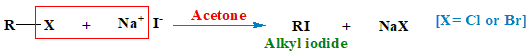 B. Finkelstein Reaction: \(RX + NaI \longrightarrow R-I + NaX\): The Finkelstein reaction is a Substitution Nucleophilic Bimolecular reaction (\(S_N2\) Reaction) that involves the exchange of halogen atoms. It is named after Hans Finkelstein, a German chemist. It is an organic reaction that uses an alkyl halide exchange into another alkyl halide through a reaction wherein the metal halide salt is used. This reaction takes place in an equilibrium process by taking the advantage of poor acetone solubility in metal halide salt that is newly formed.