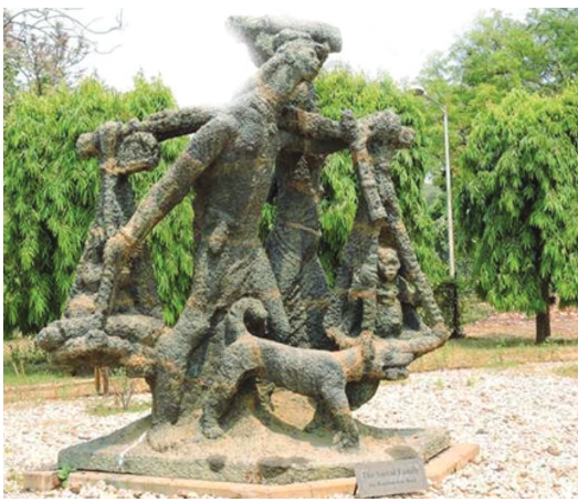 The correct answer is Option (4) → Santiniketan The given sculpture, the Santhal family is placed in the compound of Kala Bhavana, Shantiniketan, India’s first national art school. Santhal Family is an open air large-scale sculpture created by Ramkinker Baij in 1937. It is made out of metal armature and cement mixed with pebbles, and placed in the compound of Kala Bhavana, Shantiniketan, India’s first national art school. It shows a scene of a Santhal man, carrying his children in a double basket joined by a pole, and his wife and dog walking alongside. Perhaps, it speaks of the family migrating from one region to another, carrying all their frugal possessions. This must be an everyday scene for the artist living amidst the rural landscape. However, he gives it a monumental status. The sculpture is made in the round, which means that we can see it from all sides. It is placed on a low pedestal, making us feel as if we are part of the same space. The significance of this work is that it is regarded as the first public modernist sculpture in India. We do not need to go to a museum to see it as it is placed outside Kala Bhavana. The material of which it is made of is important. The artist has avoided traditional medium like marble, wood or stone, and has preferred cement, the symbol of modernisation. |
