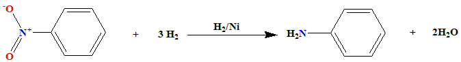 In this process: Nitrobenzene \((C_6H_5NO_2)\) is the starting material. Hydrogen gas \((H_2)\) is the reducing agent. Nickel (Ni) acts as the catalyst. Aniline \((C_6H_5NH_2)\) is the final product. The reaction can be summarized as follows: