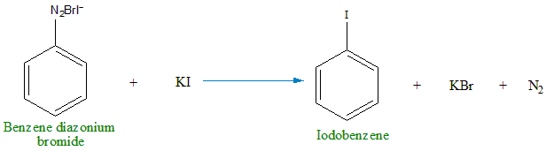 What happens when a solution of benzene diazonium bromide and an aqueous solution potassium iodide are shaken together? |