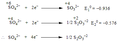 We know, \(nE^0 = n_1E_1^0 + n_2E_2^0\) \(E^0 = \frac{−2 × 0.936 − 2 × 0.576}{4}\) or, \(E^0 = −0.756 V\) |