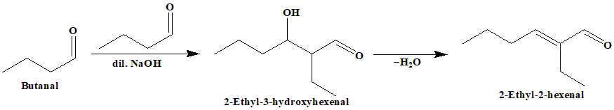 Butanal has the structure CH₃CH₂CH₂CHO. The carbonyl group is adjacent to a carbon with α-hydrogens (on the CH₂ group next to the carbonyl). Butanal can form an enolate ion under basic conditions. The aldol condensation will produce 2-ethyl-3-hydroxypentanal, which can further dehydrate to form 2-ethyl-2-hexenal.