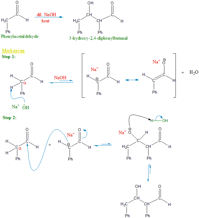 Aldehydes which contain at least \(alpha\) hydrogen atoms, undergo Aldol condensation reaction Phenylacetaldehyde contains \(alpha\) hydrogen atoms and undergoes Aldol condensation reaction in presence of dilute alkali.
