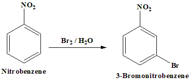 Step 2: Bromination of Nitrobenzene The bromination can be carried out using bromine (\(Br_2\)) in the presence of a catalyst such as iron (Fe) or iron(III) bromide (FeBr₃). The nitro group is a meta-directing group, meaning that when bromination occurs, the bromine will add to the meta position relative to the nitro group, resulting in 3-bromo nitrobenzene.