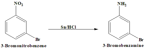 Step 3: Reduction of 3-Bromo-Nitrobenzene The reduction can be done using catalytic hydrogenation (H₂ in the presence of a catalyst like palladium or platinum) or other reducing agents like tin (Sn) with hydrochloric acid (HCl). This step will convert the nitro group (\(-NO_2\)) to an amine group (\(-NH_2\)), yielding 3-bromoaniline (or 3-bromobenzamine).