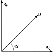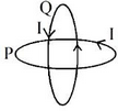 The correct answer is Option (3) → $\frac{μ_0I}{\sqrt{2}R},β=45°$ The magnetic field at the center of the loop of radius R is, $B_{loop}=\frac{μ_0I}{2R}$ $B_P=B_Q=\frac{μ_0I}{2R}$ Since, the $\vec B$ are perpendicular to each other, $B_{net}=\sqrt{{B_P}^+{B_Q}^2}=\sqrt{\left(\frac{μ_0I}{2R}\right)^2+\left(\frac{μ_0I}{2R}\right)^2}$ $=\sqrt{2}.\frac{μ_0I}{2R}=\frac{μ_0I}{\sqrt{2}R}$ and, the net $\vec B$ is directed at a 45° angle to the z-axis and the x-axis, in the plane formed by these two axis. |