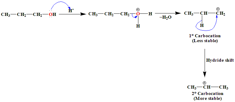Dehydration of alcohols proceeds by carbocation intermediate and primary alcohol initially gives a primary carbocation, which rearranges to more stable secondary carbocation.