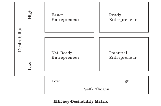 The correct answer is option 4- Anxious Entrepreneur. Anxious Entrepreneur is not a type of entrepreneur according to the Efficacy-Desirability Matrix.