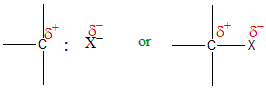 The halogen atom in haloalkanes is more electronegative than the carbon atom attached to it. As a result, the atom acquires a partial positive charge and the halogen atom a partial negative charge.