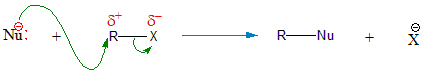 The presence of this small positive charge on the carbon atom makes it susceptible to attack by nucleophilic reagents. Thus, when a nucleophile stronger than the halide ion approaches the positively charged carbon atom of an alkylhalide, the halogen atom with its bonding pair of electrons is displaced and a new bond between the carbon atom and the incoming nucleophile is formed: