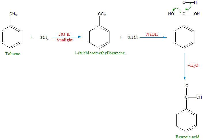 Chlorination of toluene in the presence of light and heat followed by treatment with aqueous NaOH gives |