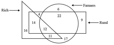 In the given diagram, the circle stands for ‘farmers’, the rectangle stands for ‘rural’, and the triangle stands for ‘rich’, The numbers given in the different segments represent the number of persons of that category. How many rural people are either farmers or rich but NOT both? |