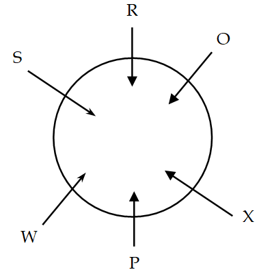 Six person are sitting around a circular table facing the centre. P is sitting between X and W. S is sitting second to the left of P. R is sitting second to the right of X. Who is sitting third to the right of O?