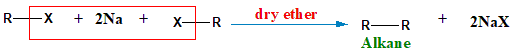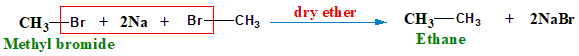 Example When two molecules of methyl bromide \((CH_3Br)\) react with sodium in dry ether, ethane \((CH_3CH_3)\) is formed: |