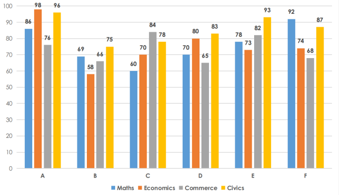 In maths , Average marks in Maths = \(\frac{86+69+60+70+78+92}{6}\) = \(\frac{ 455}{6}\) = 75.83 3 students have more marks than average. In economics , Average marks in Economics = \(\frac{98+58+70+80+73+74}{6}\) = \(\frac{ 453}{6}\) = 75.5 2 students have more marks than average. In Commerce , Average marks in Coomerce = \(\frac{76+66+84+65+82+68}{6}\) = \(\frac{ 441}{6}\) = 73.5 3 students have more marks than average. In civics, Average marks in civics = \(\frac{96+75+78+83+93+87}{6}\) = \(\frac{ 512 }{6}\) = 85.3 3 students have more marks than average. Ans :- Economics