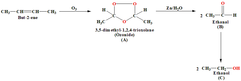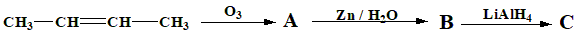 The correct answer is Option (4) → $CH_3-CH_2-OH$. The given reactant is but-2-ene which reacts with ozone \((O_3)\) to form an ozonide (A) which then reacts with \(Zn /H_2O\) to form two moles of ethanal (B). Ethanal then undergoes reduction with \(LiAlH_4\) to form ethanal (C).