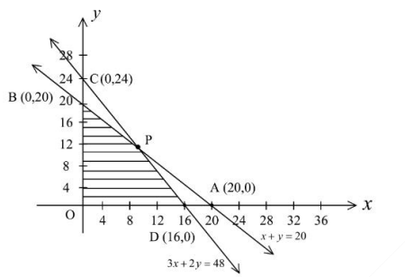 Corner points from the figure $O(0,0)$ $B(0,20)$ $D(16,0)$ $P$ = intersection of $x+y=20$ and $3x+2y=48$ Find point $P$ $x+y=20$ $3x+2y=48$ $y=20-x$ $3x+2(20-x)=48$ $3x+40-2x=48$ $x=8$ $y=12$ $P(8,12)$ Evaluate $Z=22x+18y$ $Z(0,0)=0$ $Z(0,20)=360$ $Z(16,0)=352$ $Z(8,12)=22(8)+18(12)=176+216=392$ Maximum value occurs at $(8,12)$. |