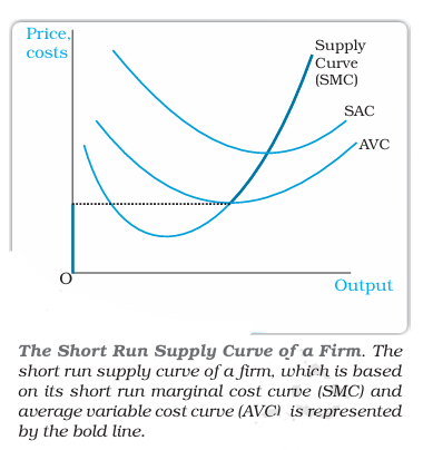 The correct answer is Option (2) → The rising part of the marginal cost curve from and above the minimum average variable cost curve. A firm’s short run supply curve is the rising part of the SMC curve from and above the minimum AVC together with zero output for all prices strictly less than the minimum AVC. In figure given below, the bold line represents the short run supply curve of the firm.