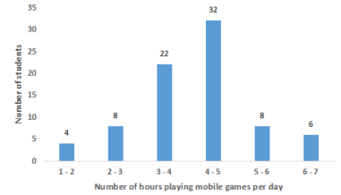 How many students spend 5 hours or more than 5 hours in playing mobile games per day ?
