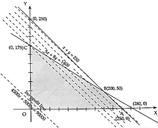 The correct answer is Option (3) → Stock 200 desktop models and 50 portable models for a maximum profit of ₹1,150,000. Let x and y be the number of desktop and portable models respectively that the merchant should stock, then the problem can be formulated as an LPP as follows: Maximise profit (in ₹) $Z = 4500x + 5000y$ Subject to constraints $x + y ≤250$ (demand constraint) $25000x + 40000y ≤7000000$ (investment constraint) or $5x+8y ≤ 1400$ $x≥0, y ≥0$ (non-negativity constraints) Draw the lines $x + y = 250$ and $5x + 8y = 1400$ and shade the region satisfied by the above inequalities. The feasible region OABC is bounded. The corner points are O(0, 0), A(250, 0), B(200, 50) and C(0, 175). Now, let us give some value to Z, say 90000 and draw a dotted line $4500x + 5000y = 90000$ which is called iso-profit line. Move this iso-profit line parallel to itself over the feasible region. It passes through all corner points one by one. The farthest corner point it crosses is B(200, 50) which gives us the optimal solution $Z = 4500 × 200 + 5000 × 50$ i.e. $Z = ₹1150000$ So, we find that the maximum value of Z occurs at B(200, 50) and maximum value = ₹1150000. Hence, for maximum profit, number of desktop models = 200 and number of portable models = 50 and the maximum profit is ₹1150000. |