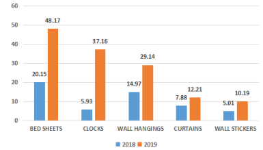 Lets solve one by one for each option. 1. Curtains Increase in sale from 2018 to 2019 = \(\frac{12.21 - 7.88 }{7.88 }\) × 100 = \(\frac{ 4.33 }{7.88 }\) × 100 = 54.94% = 55% ( approx ) 2. Bed sheets Increase in sale from 2018 to 2019 = \(\frac{48.17 - 20.15 }{20.15 }\) × 100 = \(\frac{ 28.02 }{20.15 }\) × 100 = 13.9% 3. Wall stickers Increase in sale from 2018 to 2019 = \(\frac{10.19 - 5.01 }{5.01 }\) × 100 = \(\frac{ 5.18 }{5.01 }\) × 100 = 103.39% 4. Wall hangings Increase in sale from 2018 to 2019 = \(\frac{29.14 - 14.97 }{14.97 }\) × 100 = \(\frac{14.17 }{14.97 }\) × 100 = 94.65% Ans :- Curtains