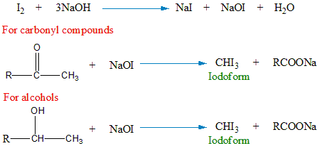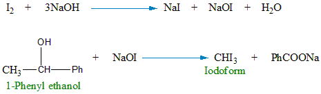 The first step is the reaction of iodine with sodium hydroxide to form sodium hypoiodite. Sodium hypoiodite is then reacted with the methyl ketone or secondary alcohol to form iodoform and sodium acetate. Iodoform is a pale yellow precipitate, so its formation indicates that the compound being tested contains a methyl ketone or secondary alcohol with a methyl group in the alpha position. The iodoform test is a very sensitive test, and it can be used to detect even small amounts of methyl ketones or secondary alcohols. It is a useful tool for identifying these compounds in organic samples. In this question, only 1-phenyl ethanol contains a methyl group at the alpha position w.r.t the secondary alcohol group. So, only 1-phenyl ethanol will show the iodoform test.