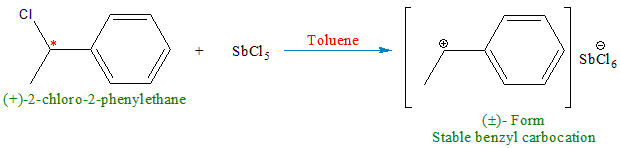 The solution of (+)-2-chloro-2-phenylethane in toluene racemizes slowly in the presence of small amount of SbCl5; due to the formation of |