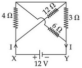 The correct answer is Option (2) → 2.4 A $I=I_1+I_2=I_4+I_3+I_2$ ...(1) $I_1=I_4+I_3$ ...(2) By kirchoff voltage law, $ΔV=0$ $12-4I_1-(I_4+I_2)3=0$ ...(3) $12-12I_2-(I_4+I_2)3=0$ ...(4) $12-4I_1-6I_3=0$ ...(5) Consider eq. (5) $12-4I_1=6I_3$ Putting this in eq. (3) $6I_3=(I_4+I_2)3$ $2I_3=I_4+I_2$ Substituting this in eq. (1) $I=2I_3+I_3=3I_3$ ∴ On solving above equations $I=3I_3$ $=3×0.8$ $=2.4A$ |