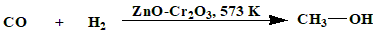 The correct answer is option 1. by catalytic reduction of carbon monoxide. Methanol is an organic compound having the functional group alcohol \((-OH)\). Its molecular formula is, \(CH_3OH\). Methanol is a liquid compound at room temperature but it is volatile in nature. Its boiling point is \(64.7^oC\). Commercially, methanol is prepared by catalytic reduction of carbon monoxide. In the process of synthesis of methanol, water gas is used. Water-gas is an equimolar mixture of carbon monoxide, \(CO\) and hydrogen, \(H_2\). The reaction takes place in the presence of zinc oxide, \(ZnO\) and chromium oxide, \(Cr_2O_3\) as the catalyst and at 573K temperature. The reaction is represented as follows: