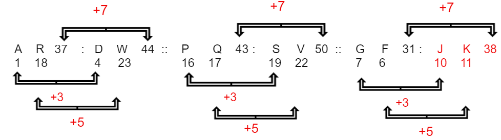 Select the option that is related to the fifth term in the same way as the second term is related to the first term and fourth term is related to the third term. AR37 : DW44 :: PQ43 : SV50 :: GF31 : ? |