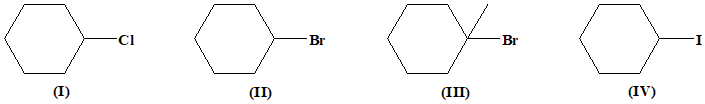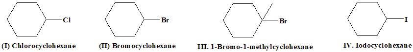 To determine the correct order of reactivity of the given halides towards the \(S_N1\) reaction, we need to understand the underlying principles that govern the \(S_N1\) mechanism. The \(S_N1\) reaction, or unimolecular nucleophilic substitution, is a two-step process: Formation of a Carbocation Intermediate: The halide leaves, forming a positively charged carbocation. The stability of this carbocation is crucial because the rate-determining step (slowest step) of the \(S_N1\) reaction is the formation of the carbocation. Nucleophilic Attack: The nucleophile then attacks the carbocation to form the final product. The reactivity in an \(S_N1\) reaction is influenced primarily by two factors: Carbocation Stability: The more stable the carbocation, the faster it will form, and therefore, the faster the \(S_N1\) reaction will proceed. Carbocation stability increases in the order: Tertiary \(> \) Secondary \(> \) Primary This is due to the inductive effect and hyperconjugation, which help stabilize the positive charge on the carbocation. Leaving Group Ability: The better the leaving group, the easier it is for the halide to leave and form the carbocation. Leaving group ability increases in the order: \( \text{F}^- < \text{Cl}^- < \text{Br}^- < \text{I}^- \) A better leaving group is one that can stabilize the negative charge once it leaves the molecule. Now, let us analyze each of the given compounds: Carbocation Stability: The carbocation formed after the departure of the chloride ion is a secondary cyclohexyl carbocation. Secondary carbocations are moderately stable but less stable than tertiary carbocations. Leaving Group: Chlorine (\( \text{Cl}^- \)) is a decent leaving group, but not as good as bromine or iodine. Carbocation Stability: Similar to chlorocyclohexane, bromocyclohexane forms a secondary cyclohexyl carbocation. The stability is the same as in chlorocyclohexane. Leaving Group: Bromine (\( \text{Br}^- \)) is a better leaving group than chlorine, so bromocyclohexane will react faster than chlorocyclohexane. III. 1-Bromo-1-methylcyclohexane: Carbocation Stability: Upon the departure of the bromide ion, a tertiary carbocation (1-methylcyclohexyl carbocation) is formed. Tertiary carbocations are significantly more stable than secondary or primary carbocations due to the greater number of alkyl groups that can donate electron density through inductive and hyperconjugation effects. Leaving Group: Bromine is a good leaving group. Due to the formation of a highly stable tertiary carbocation, 1-bromo-1-methylcyclohexane will have the highest reactivity in the \(S_N1\) reaction. Carbocation Stability: Similar to the previous halides, iodocyclohexane forms a secondary cyclohexyl carbocation, which is moderately stable. Leaving Group: Iodine (\( \text{I}^- \)) is the best leaving group among the halides mentioned, so iodocyclohexane will react faster than bromocyclohexane and chlorocyclohexane. Thus the correct Order of Reactivity is III > IV > II > I. |