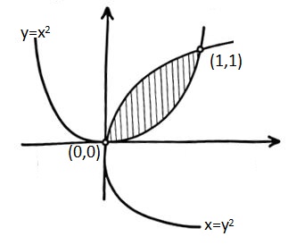 So $y=x^2$, and $x=y^2$ finding area along x-axis uppor cueve $y^2=x$ $\Rightarrow y=\sqrt{x}$ lower corve $y=x^2$ intersecting points $x^2=\sqrt{x}$ So x = 0, 1 y = 0, 1 So area $=\int\limits_0^1 \sqrt{x}-x^2 d x$ area $=\int\limits_0^1 \sqrt{x}-x^2 d x= \left[\frac{x^{\frac{1}{2}+1}}{\frac{1}{2}+1}-\frac{x^{2+1}}{2+1}\right]_0^1$ $=\left[\frac{2}{3} x^{3 / 2}-\frac{x^3}{3}\right]_0^1$ $=\frac{2}{3}-\frac{1}{3}$ $=\frac{1}{3}$ |