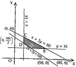 The correct answer is Option (2) → ₹1440 Let x and y be the number of units of products A and B respectively manufactured (and sold), then total profit $P = 20x + 30y$ (in ₹). Hence, the problem can be formulated as an L.P.P. as follows: Maximize $P = 20x + 30y$ subject to the constraints $200x + 300y ≥ 10000$ i.e. $2x + 3y ≥ 100$ (turnover constraint) $\frac{1}{2}x + 1.y ≤ 40$ i.e. $x + 2y ≤ 80$ $x ≥ 14, y ≥ 16, x ≥ 0, y ≥ 0$. (time constraint) We draw the straight lines $2x + 3y = 100, x + 2y = 80, x = 14$ and $y = 16$ and shade the region satisfied by the above inequalities. The shaded portion shows the feasible region ABCD, which is bounded. The corner points of the feasible region ABCD are A(26, 16), B(48, 16), C(14, 33) and D(14, 24). The optimal solution occurs at one of the corner points. At $A, P = 20 × 26 + 30 × 16 = 1000$. At $B, P = 20 × 48 + 30 × 16 = 1440$. At $C, P = 20 × 14 + 30 × 33 = 1270$. At $D, P = 20 × 14 + 30 × 24 = 1000$. Hence, the manufacturer should produce 48 units of product A and 16 units of product B. Maximum profit is ₹1440. |