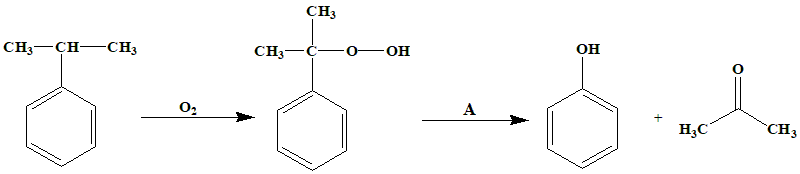 The correct answer is option 4. \(H_3O^+\). The name of the initial reactant is cumene. Its scientific name is isopropyl benzene. It is a natural by-product of the extraction of crude oil and coal tar which are petroleum products. Cumene is a colourless and volatile liquid which has a smell similar to gasoline. It is used in industries for the production of phenol on a large scale. The reaction of cumene that produces phenol is as shown below: