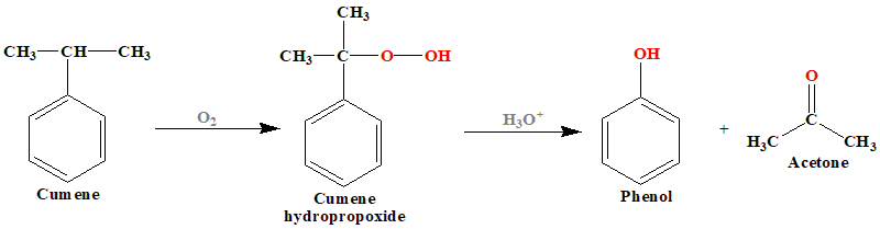 Taking the above reaction in a stepwise manner is good for health. It is as explained below: (i) Cumene is first oxidised into cumene hydroperoxide by exposing it to air. This process is called air oxidation as no specific reagent is added to the reaction mixture for oxidising cumene. The product is a peroxide which means it has an “O−O” bond. This process follows a free-radical mechanism. (ii) The degradation of cumene hydroperoxide occurs through hydrolysis in an acidic medium. The mechanism in this case involves a carbocation intermediate. The carbocation is tertiary in nature and has the following structure: