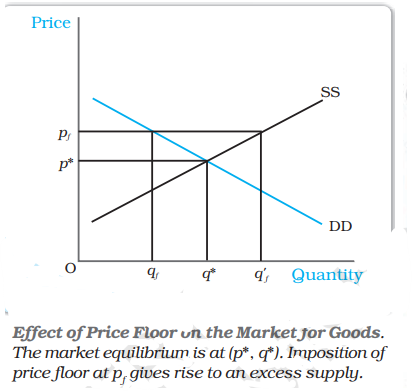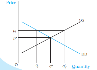 The correct answer is Option 4: Both 2 and 3 It can be clearly seen that at price p*, there is equilibrium in the market with market demand and supply curve intersecting each other. But at price pf, supply is greater than demand, indicating a situation of excess supply.