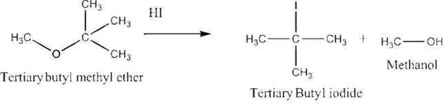 In presence of HI: Protonation of ether oxygen occurs first. Then cleavage follows SN1 pathway at the tertiary carbon because tert-butyl carbocation is highly stable. Thus: tert-butyl group forms tert-butyl iodide Remaining group forms methanol Option 1: Methanol and tert-butyl iodide Correct because cleavage occurs at tertiary side via SN1 mechanism. Option 2: Methyl iodide and tert-butanol Incorrect because SN2 at methyl group is not favoured when tertiary carbocation can form. Option 3: tert-butyl iodide Incorrect because methanol is also formed. Option 4: Methanol Incorrect because tert-butyl iodide is also produced. |