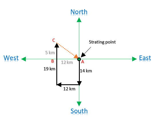 Rahul travelled 14 km Southward then turned right and travelled 12 km, then again turned right and travelled 19 km. How far was Rahul from the starting point? |