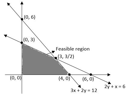 Constraints for a LPP are : $x+2y≤6, 3x+2y ≤ 12, x≥0, y ≥ 0$ Then corner point in the feasible region which is not on any of the axes is : |