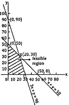 The correct answer is Option (2) → Maximum $Z=1800$, Minimum $Z=0$ We draw the lines $x + y = 50, 3x + y = 90$ and shade the region satisfied by the given inequalities. The shaded region in the adjoining figure shows the feasible region determined by the given constraints. We observe that the feasible region OABC is convex polygon and bounded. So we use the corner point method to calculate the maximum and minimum value of Z. The coordinates of the corner points O, A, B, C are (0, 0), (30, 0), (20, 30) and (0,50) respectively. We evaluate $Z=60x + 15y$ at each of these points.