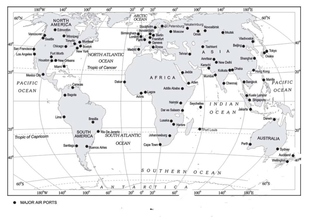 Arrange the following international airports in east to west direction. (A) Sydney Choose the correct answer from the options given below: |