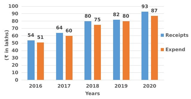 percentage increase in receipts from 2017 to 2018 = \(\frac{80 - 64}{64}\) × 100 = \(\frac{1}{4}\) × 100 = 25%
