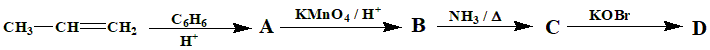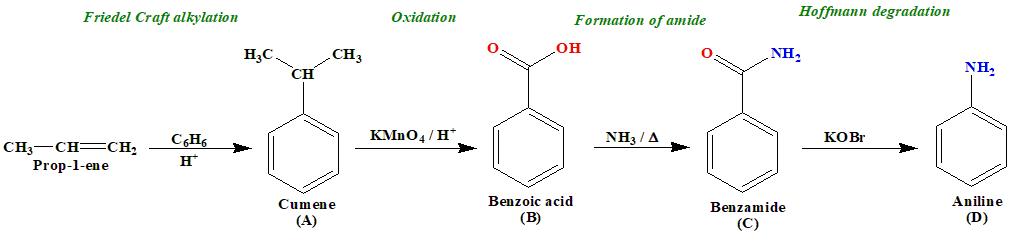 This reaction sequence illustrates the transformation of an alkene (propene) to a primary aromatic amine (aniline) through a series of well-known organic reactions: Friedel-Crafts alkylation, oxidation, formation of amide, and the Hoffmann degradation. |