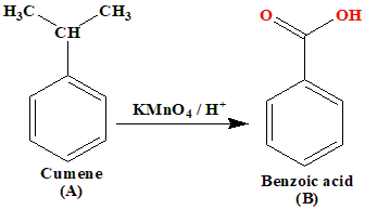 Step 2: \(A \ \overset{KMnO_4 / H^+ }{\longrightarrow} B\) In this step, cumene undergoes strong oxidation with potassium permanganate (\(KMnO_4\)) in acidic conditions. \(KMnO_4\) is a powerful oxidizing agent, and when it reacts with side chains on aromatic rings, it typically oxidizes the entire alkyl group, regardless of its size or branching, into a carboxyl group (-COOH). Cumene \(C_6H_5-CH(CH_3)_2\) is oxidized to benzoic acid \(C_6H_5-COOH\). So, compound B is benzoic acid.