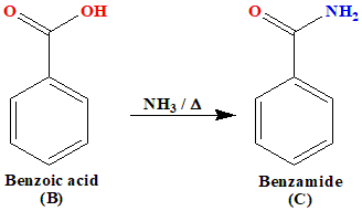 Step 3: \(B \ \overset{NH_3 / \Delta }{\longrightarrow} C\) In this step, benzoic acid is heated with ammonia (\(NH_3\)). The reaction between a carboxylic acid and ammonia under heat leads to the formation of an amide. Benzoic acid (\(C_6H_5-COOH\)) reacts with ammonia to form **benzamide** (\(C_6H_5-CONH_2\)) by releasing a molecule of water. So, compound C is benzamide.