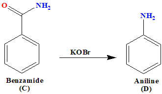 Step 4: \(C \ \overset{KOBr }{\longrightarrow} D\) This step involves the Hoffmann bromamide degradation reaction. In this reaction, an amide reacts with bromine in a basic medium (here potassium hypobromite, \(KOBr\)) to produce a primary amine with one less carbon atom than the amide. Benzamide (\(C_6H_5-CONH_2\)) reacts with \(KOBr\) and undergoes a rearrangement that results in the formation of aniline (\(C_6H_5-NH_2\)). So, compound D is aniline.